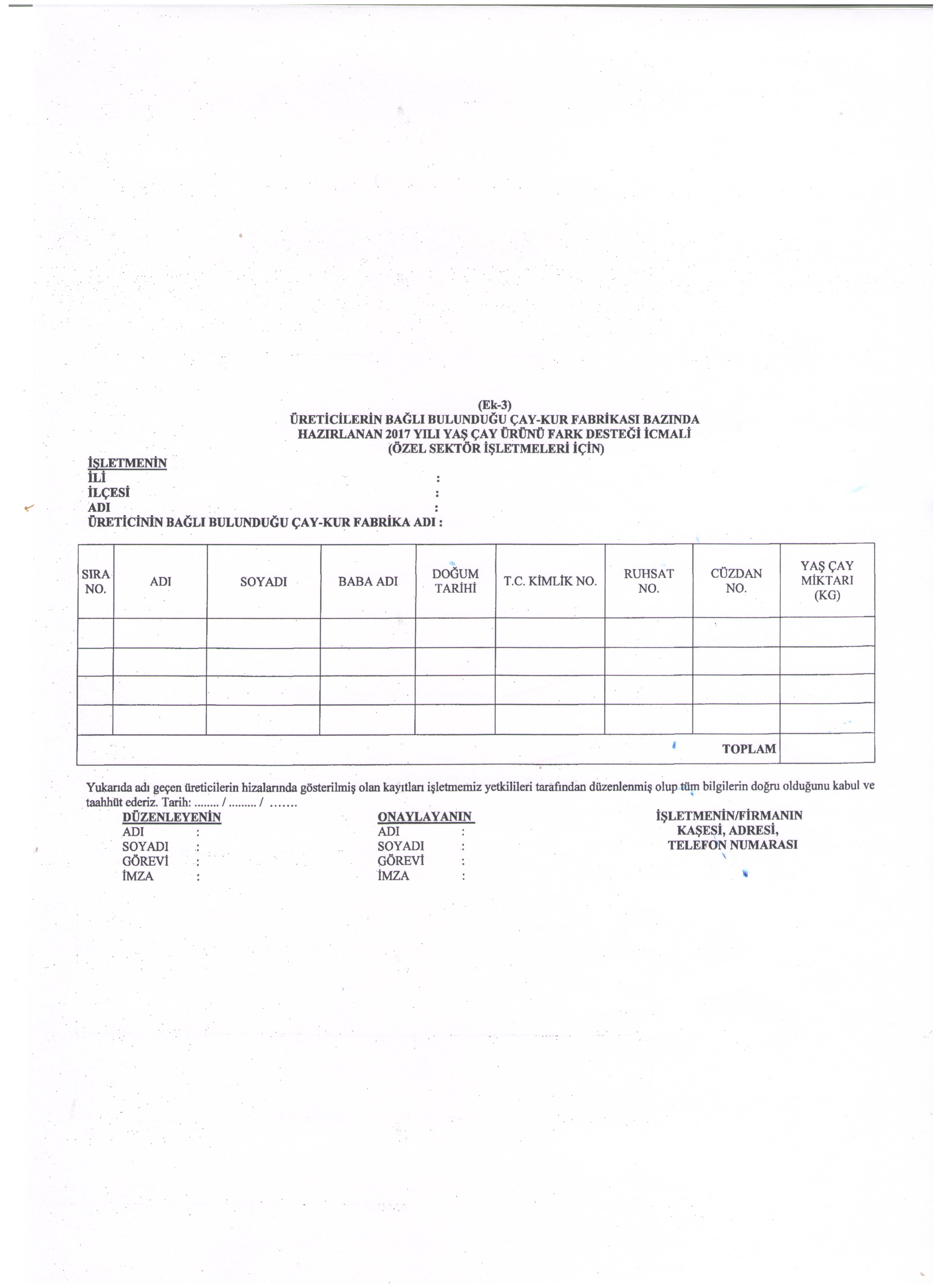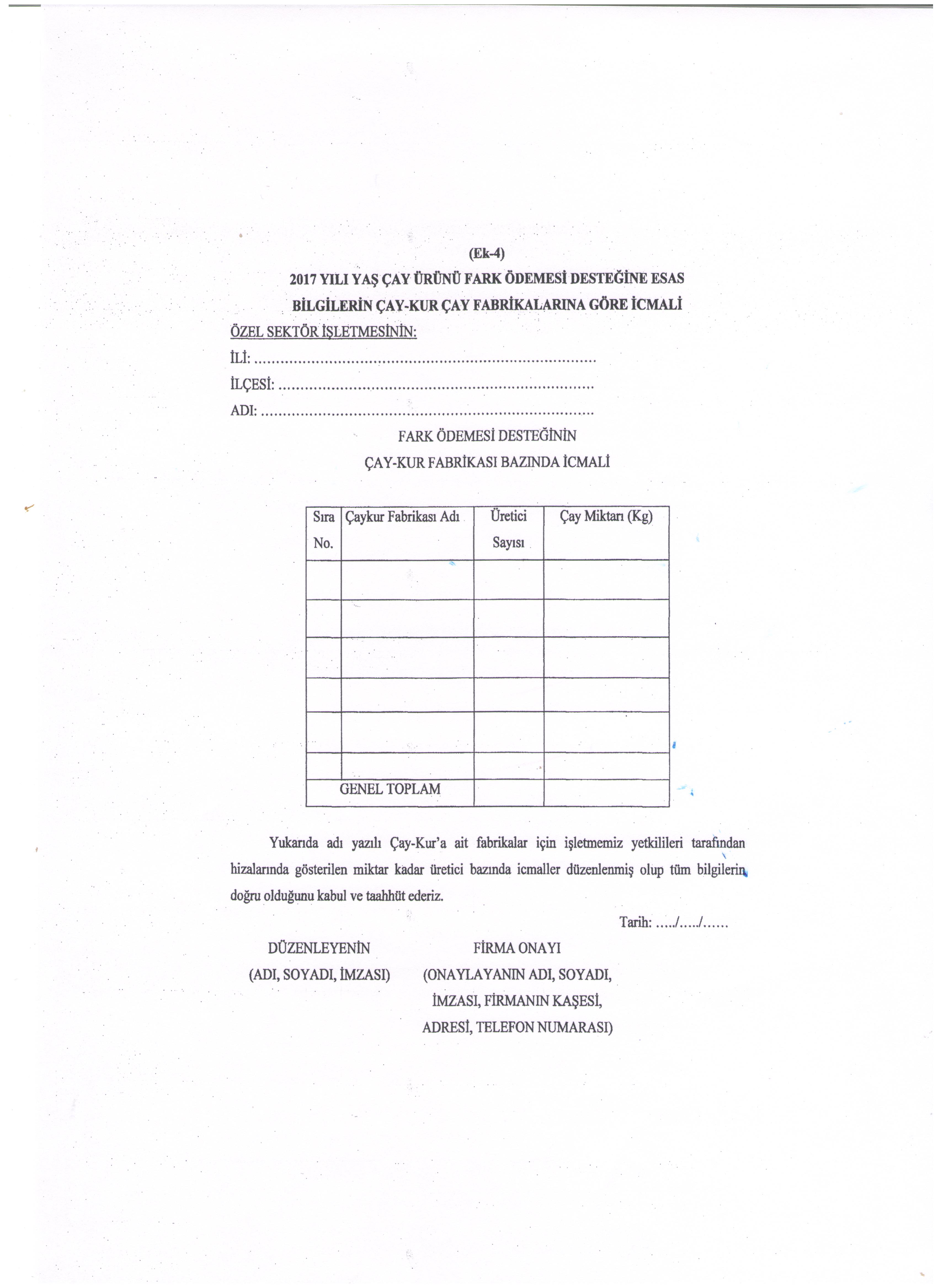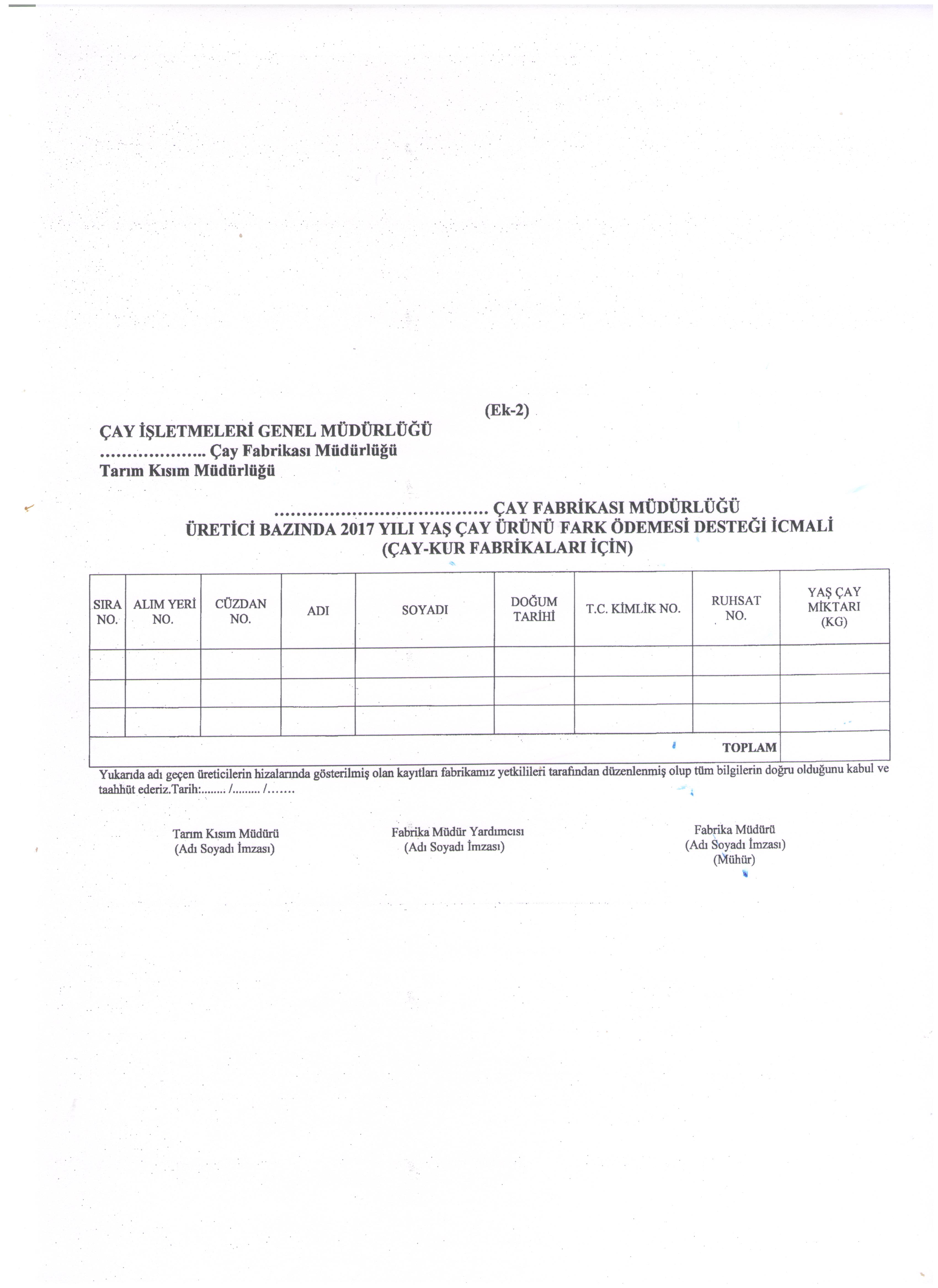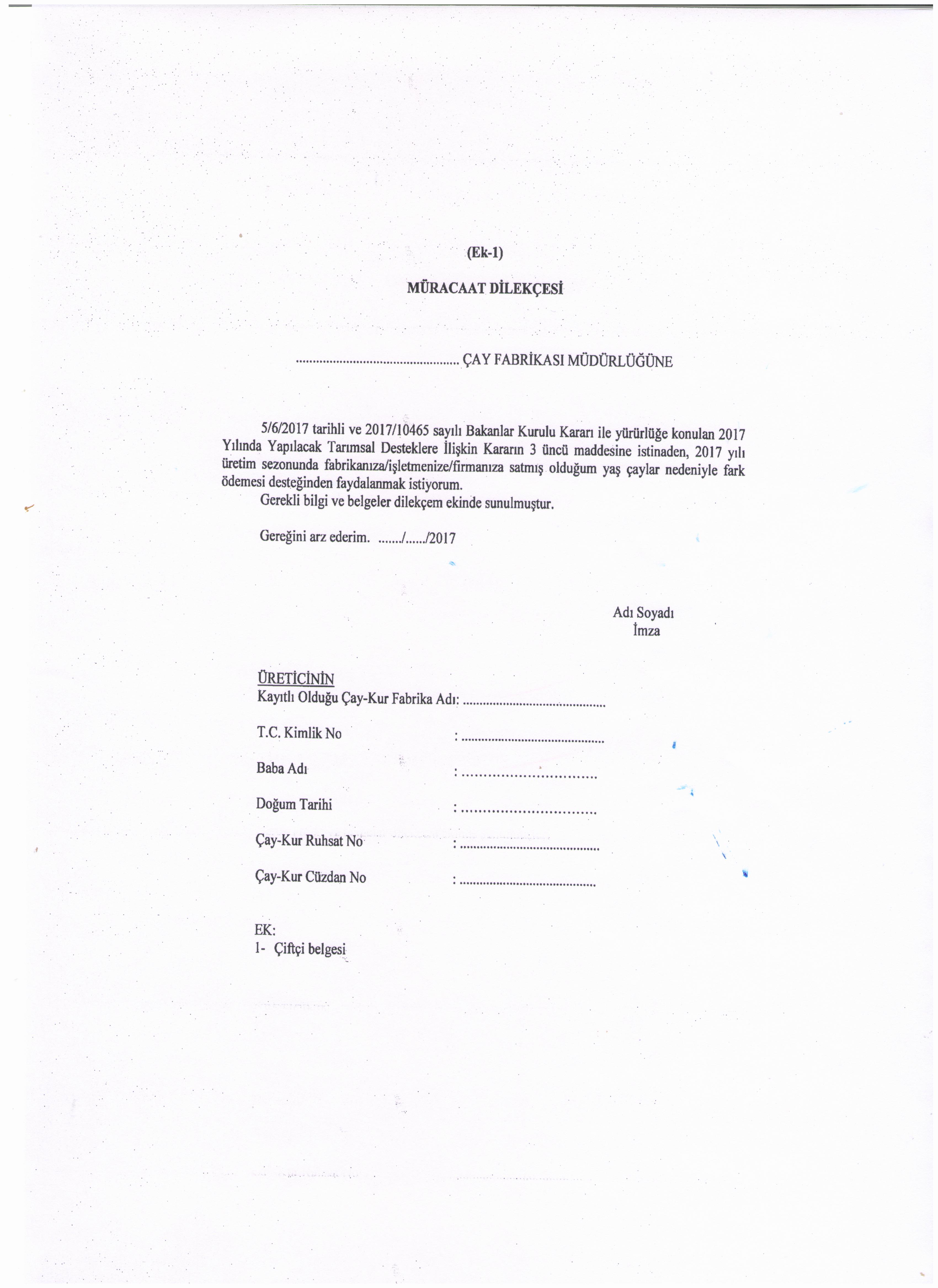 Gıda, Tarım ve Hayvancılık Bakanlığından: TÜRKİYE TARIM HAVZALARI ÜRETİM VE DESTEKLEME MODELİNE GÖRE YAŞ ÇAY ÜRETİCİLERİNE 2017 YILI YAŞ ÇAY ÜRÜNÜ İÇİN FARK ÖDEMESİ DESTEĞİ YAPILMASINA DAİR TEBLİĞ (TEBLİĞ NO: 2017/33) Amaç MADDE 1 – (1) Bu Tebliğin amacı; 5/6/2017 tarihli ve 2017/10465 sayılı Bakanlar Kurulu Kararı ile yürürlüğe konulan 2017 Yılında Yapılacak Tarımsal Desteklemelere İlişkin Karar ekinde yer alan Türkiye Tarım Havzaları Üretim ve Destekleme Modeli listesinde belirlenen havzalarda desteklemeye esas 2017 yılı üretim sezonunda üretilen ve satışı yapılan yaş çay yaprağına verilecek fark ödemesi desteğine ilişkin usul ve esasları belirlemektir. Kapsam MADDE 2 – (1) Bu Tebliğ; 2/4/2012 tarihli ve 2012/3067 sayılı Bakanlar Kurulu Kararı ile yürürlüğe konulan Çay Tarım Alanlarının Belirlenmesi ve Bu Alanlarda Çay Tarımı Yapan Üreticilere Ruhsatname Verilmesine Dair Karar ile belirlenen ve üretime izin verilen çay alanlarında Çay İşletmeleri Genel Müdürlüğü (ÇAY-KUR) tarafından düzenlenip kontrolleri yapılan ruhsatlı çay alanlarında 2017 yılı üretim sezonunda yaş çay yaprağı üreterek satışını yapan ruhsatlı üreticilerin desteklenmesini kapsar. Dayanak MADDE 3 – (1) Bu Tebliğ, 5/6/2017 tarihli ve 2017/10465 sayılı Bakanlar Kurulu Kararı ile yürürlüğe konulan 2017 Yılında Yapılacak Tarımsal Desteklemelere İlişkin Karara dayanılarak hazırlanmıştır. Tanımlar MADDE 4 – (1) Bu Tebliğde geçen; a) Bakanlık: Gıda, Tarım ve Hayvancılık Bakanlığını, b) Çay tarım alanı: Çay Tarım Alanlarının Belirlenmesi ve Bu Alanlarda Çay Tarımı Yapan Üreticilere Ruhsatname Verilmesine Dair Karar ile belirlenen ve çay üretimine izin verilen çay alanlarını, c) ÇAY-KUR: Çay İşletmeleri Genel Müdürlüğünü, ç) Karar: 5/6/2017 tarihli ve 2017/10465 sayılı Bakanlar Kurulu Kararı ile yürürlüğe konulan 2017 Yılında Yapılacak Tarımsal Desteklemelere İlişkin Kararı, d) Özel sektör işletmeleri: Ruhsatlı üreticilerden yaş çay alımını yapan ve satın aldığı yaş çayı ticaret borsalarında tescil ettiren ticari firmaları/işletmeleri, e) Ruhsatlı çaylık alan: Ruhsatnamede belirtilen ve üzerinde çay tarımı yapılan alanı, f) Ruhsatlı üretici: Çay tarım alanlarında çay tarımı yapan gerçek ve tüzel kişileri, g) Üretim sezonu: 3/5/2017-31/12/2017 tarihleri arasını, ifade eder. Ödeme yapılacak üreticiler MADDE 5 – (1) Ödemeler; ruhsatlı üretici olup Karardan önceki yaş çay ürünü destekleme ödemelerine ilişkin kararnameler doğrultusunda yaş çay ürünü destekleme ödemelerinden faydalanmak için kamu ve/veya özel sektör işletmelerine başvuruda bulunan ve 2017 yılı üretim sezonunda da üreticiliği devam eden ruhsatlı üreticiler ile ilk defa 2017 yılı üretim sezonunda yaş çay yaprağı üreterek satışını yapan ruhsatlı üreticilere yapılır. Ödeme miktarı MADDE 6 – (1) 5 inci maddede belirtilen ruhsatlı üreticilere 2017 yılı yaş çay ürünü için fark ödemesi desteği yapılır. Fark ödemesi desteği kilogram başına 13 kuruş olarak belirlenmiştir. Finansman ve ödemeler MADDE 7 – (1) Bakanlık, 2018 Mali Yılı Bütçesinin ilgili harcama kaleminden, T.C. Ziraat Bankası A.Ş. Genel Müdürlüğü tarafından, doğrudan üreticilere ödeme yapılmak üzere ÇAY-KUR’a kaynak aktarır. Bu Tebliğin uygulanmasıyla ilgili olarak üstlendiği hizmetlerden dolayı üreticilere ödenen destek tutarının % 0,1’i oranında hizmet komisyonu ÇAY-KUR’a, % 0,2’si oranında hizmet komisyonu ise T.C. Ziraat Bankası A.Ş. Genel Müdürlüğüne Bakanlık tarafından ayrıca ödenir. (2) Fark ödemesi desteği, T.C. Ziraat Bankası A.Ş. Genel Müdürlüğü tarafından, Bakanlığın ilgili kuruluşu olan ÇAY-KUR aracılığı ile üreticilere ödenir. (3) Ödemeler, ÇAY-KUR’a kaynak aktarılmasını müteakip, ruhsatlı üreticilerin kayıtlı olduğu ÇAY-KUR fabrikalarının anlaşmalı olduğu bankalardaki üretici adına önceden açılmış bulunan hesaplara yapılır. (4) Ruhsatlı üreticinin kayıtlı olduğu ÇAY-KUR fabrikasının anlaşmalı olduğu bankada adına açılmış hesabı bulunmayan üreticilere ödeme yapılmaz. Ödeme hesap açılması halinde yapılır. Görevli kurum ve kuruluşlar MADDE 8 – (1) 2017 yılı yaş çay ürünü fark ödemesi desteği, ÇAY-KUR ve Bakanlık tarafından yürütülür. Başvurular MADDE 9 – (1) Ruhsatlı üretici olup, Karardan önceki yaş çay ürünü destekleme ödemelerine ilişkin kararnameler doğrultusunda yaş çay ürünü destekleme ödemelerinden faydalanmak için kamu ve/veya özel sektör işletmelerine başvuruda bulunan ve 2017 yılı üretim sezonunda da üreticiliği devam eden ruhsatlı üreticilerin belgeleri, 2017 yılı fark ödemesi desteği için de geçerlidir. Kamu ve özel sektör işletmeleri tarafından, bu üreticilere 2017 yılı üretim sezonunda sattıkları yaş çay miktarı üzerinden, üretici başvurusu olmaksızın 2017 yılı fark ödemesi desteği düzenlenir. Ancak kamu ve/veya özel sektör işletmelerine 2017 yılı üretim sezonunda sattıkları yaş çay nedeniyle, bu fark ödemesi desteğinden ilk defa yararlanmak isteyenler ile bu yıl farklı özel sektör işletmelerine yaş çay satan ruhsatlı üreticiler, 22/12/2017 tarihi mesai bitimine kadar çiftçi belgesi ve Ek-1’de yer alan başvuru dilekçesi ile birlikte T.C. kimlik numarasını beyan ederek yaş çay sattıkları kamu ve/veya özel sektör işletmelerine başvururlar. Başvuru dilekçesi ve çiftçi belgesinin yaş çay satılan tüm kamu ve özel sektör işletmelerine verilmesi zorunludur. Fark ödemesi desteğine esas yaş çayın satın alınması, tescili, onayı ve icmallerin hazırlanması MADDE 10 – (1) Kamu ve özel sektör işletmeleri, 4/1/1961 tarihli